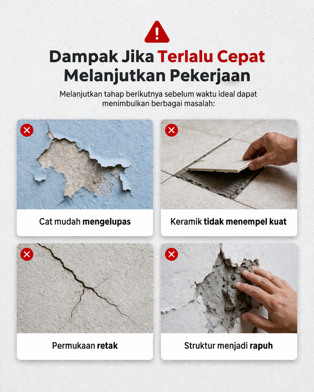 - Plester dinding: Minimal 24 jam sebelum tahap finishing ringan.